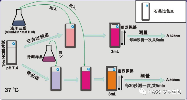 鄰苯三酚在堿性條件下能迅速發(fā)生氧化鏈?zhǔn)椒磻?yīng),釋放出超氧陰離子自由基(O2—),O2—進(jìn)一步加速鄰苯三酚的氧化,生成在320 nm 處有特殊吸收的中間產(chǎn)物。若在反應(yīng)體系中加入抗氧化物,可清除O2—,阻止中間產(chǎn)物的積累,使得在320 nm處的吸光度減小。