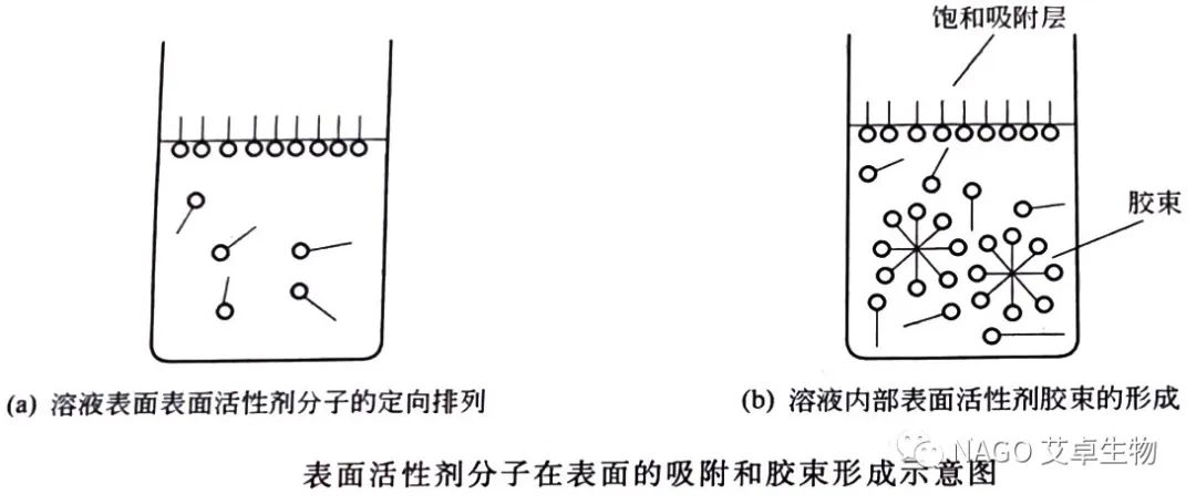 當它們在溶液中以很低的濃度溶解分散時,優先地吸附在溶液的表面或其他界面上,形成定向排列的表面層。使表面或界面張力(或自由能)顯著降低,改變體系的界面狀態;當達到一定濃度時,溶液中締合成膠團,從而直接地產生潤濕或反潤濕、乳化或破乳、起泡或消泡、分散、加溶和洗滌等作用。(如下圖所示)